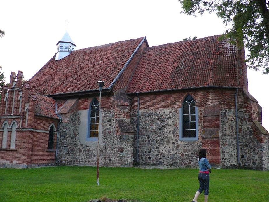 Pierwotne ściany z kamienia polnego stanowią obecnie bazę budowli, później podwyższono kościół domurówką ceglaną. Przed kościołem drzewa, przy kościele cmentarzyk, zapada głęboki wieczór...